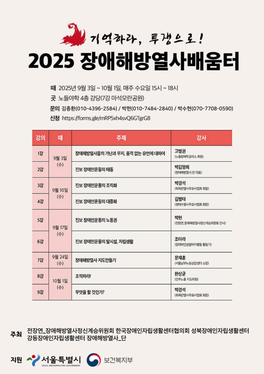 기억하라, 투쟁으로! 2025 장애해방열사배움터 9월 3일(수) 1강 장애해방열사들의 가난과 무지, 품격 없는 유언에 대하여 _ 고병권(노들장애학궁리소 회원) 2강 진보 장애인운동의 태동 _ 박김영희(장애해방열사_단 대표) 9월 10일(수) 3강 진보 장애인운동의 조직화 _ 박경석(최옥란열사추모사업회 회장) 4강 진보 장애인운동의 대중화 _ 김병태(정태수열사추모사업회 회장) 9월 17일(수) 5강 진보 장애인운동의 노동권 _ 박현(전장연_장애해방열사정신계승위원회 간사) 6강 진보 장애인운동의 탈시설, 자립생활 _ 조아라(장애와인권발바닥행동 활동가) 9월 24일(수) 7강 장애해방열사 지도 만들기 _ 문재훈(서울남부노동상담센터 소장) 10월 1일(수) 8강 특강 – 조직하라! _ 한상균(민주노총 지도위원) 9강 무엇을 할 것인가? _ 박경석(최옥란열사추모사업회 회장) * 때 : 2025년 9월 3일 ~ 10월 1일 매주 수요일 늦은 3시 * 곳 : 노들장애인야학 4층 강당(7강_마석 모란공원) * 주최 : 전장연_장애해방열사정신계승위원회, 한국장애인자립생활센터협의회, 성북장애인자립생활센터, 강동장애인자립생활센터, 장애해방열사_단 * 마감 : 8월 31일 / 선착순 50명(조기 마감될 수 있습니다) * 문의 : 김종환(010-4396-2584) / 박현(010-7484-2840) / 박수현(070-7708-0590) * 신청 : https://forms.gle/mRP5xh4svQ6GTgrG8 |