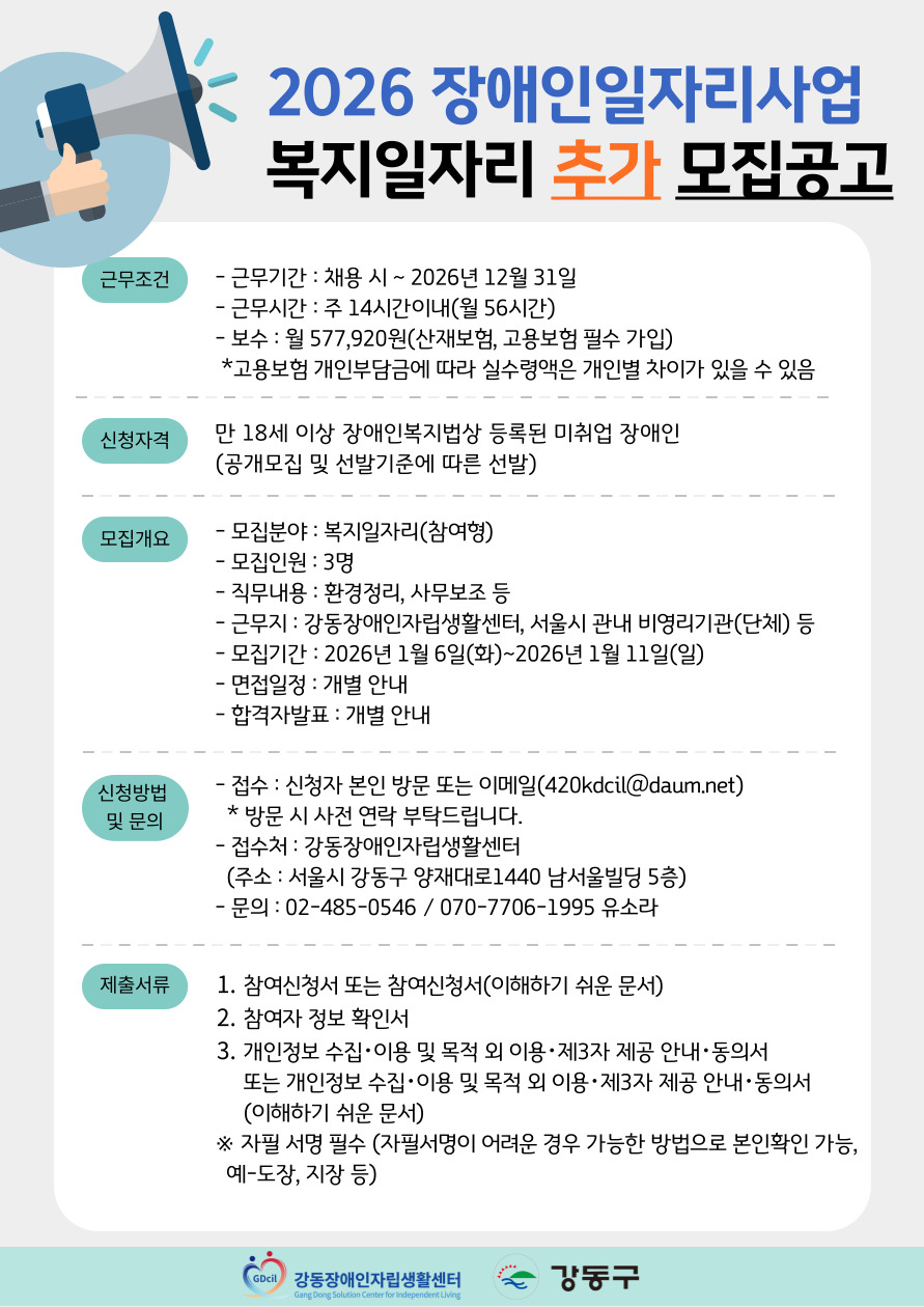 2026년 장애인일자리사업 복지일자리 참여자 추가 모집공고 강동장애인자립생활센터에서는 장애인의 사회참여 확대와 소득보장을 도모하기 위하여 복지일자리사업에 참여하실 장애인을 추가 모집하오니 많은 지원 바랍니다. 1. 근무조건 - 근무기간 : 2026년 채용 시 ~ 12월 - 근무시간 : 주 14시간 이내 근무(월 56시간) - 보수 : 월 577,920원(산재보험, 고용보험 필수 가입) * 참여형 참여자는 고용보험 개인부담금액에 따라 실수령액은 개인별 차이가 있을 수 있습니다. 2. 모집분야 및 기간 - 모집인원 : 복지일자리(참여형) 3명 - 모집분야 : 직무 - 환경정리, 사무보조 등 - 근무지 : 강동장애인자립생활센터, 서울시 관내 비영리기관 등 - 모집기간 : 2026년 1월 6일(화) ~ 1월 11일(일) 3. 신청자격 및 선발방법 - 신청자격 : 18세 이상 장애인복지법상 등록된 미취업 장애인 - 선발방법 : 공개모집 및 선발기준에 따른 선발 - 면접일정 면접 대상자 발표 : 개별 안내 면접 일정 : 개별 안내 최종합격자 발표 : 개별 안내 4. 제출서류 <필수서류> - 참여신청서 : 희망직무 기재 필수 - 참여자 정보 확인서 : 사업자등록증 소지 여부, 장애등록 여부, 장기요양등급 판정 여부, 미취업 상태 여부, 임직원 겸임 여부 작성 - 개인정보 수집 이용 및 제3자 제공 안내 및 동의서 * 참여신청서 및 개인정보동의서 작성 시, 자필 서명 필수 다만 자필서명이 어려운 경우 가능한 방법으로 본인 확인 가능(예, 도장 등) 5. 접수방법 : 방문 또는 이메일 접수 - 내방 : 신청자 본인 직접 내방 신청 - 이메일 : 420kdcil@daum.net - 접수처 : 강동장애인자립생활센터(주소 : 서울시 강동구 양재대로1440, 남서울빌딩 5층) - 연락처 : 02-485-0526 / 직통 070-706-1995 |