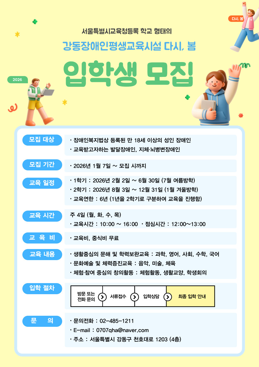 [2026년 강동장애인평생교육시설 다시,봄 입학생 모집 ] 서울특별시 교육청등록 학교 형태의 강동장애인평생교육시설 다시,봄 에서 입학생을 모집합니다. <강동장애인평생교육시설 다시,봄 교육과정개요> 1. 교육목적 ∙ 장애인의 완전한 사회통합과 차별없는 세상을 위해 교육으로부터 소외된 장애인에게 교육의 기회를 제공하고, 사회참여에 필요한 교과 프로그램의 전달을 목적으로 함. 2. 교육과정 ∙ 교육과정 : 초등교육과정 ∙ 교육연한 : 6년 (1년을 2학기로 구분하여 교육을 진행함) ∙ 교육시간 : 주 4일 (월, 화, 수, 목) 10:00 ~ 16:00 ※점심시간 : 12:00 ~ 13:00 ∙ 교육비 : 교육비, 중식비 무료 <모집개요 및 신청방법> 1. 모집기간 ∙ 2026년 1월 7일(수) ~ 모집 시까지 2. 모집대상 ∙ 장애인복지법상 등록된 만 18세 이상의 성인 장애인 ∙ 교육을 받고자 하는 발달장애인, 지체·뇌병변장애인 3. 교육일정 ∙1학기 : 2026년 2월 2일(월) ~ 6월 30일(화) (7월 여름방학) ∙2학기 : 2026년 8월 3일(월) ~ 12월 31일(목) (1월 겨울방학) 4. 교육내용 ∙ 생활중심의 문해 및 학력보완 교과교육 : 과학, 영어, 사회, 수학, 국어 ∙ 문화예술 및 체력증진교육 : 음악, 미술, 체육 ∙ 체험·참여 중심의 창의활동 : 체험활동, 생활교양, 학생회의 5. 신청방법 ① 사전 방문예약 * 갑작스러운 방문 시 상담이 어려울 수 있으니방문 전 전화를 통해 방문예약 부탁드립니다. ② 방문 접수(서울시 강동구 길동 148-2, 4층) ③ 서류확인 및 입학상담 진행 ④ 최종 입학안내 6. 신청문의 (02-485-1211) 7. 제출서류 ∙ 강동장애인평생교육시설 입학신청서(소정양식) 1부 ∙ 복지카드 사본 1부 ∙ 개인정보 활용 동의서 1부